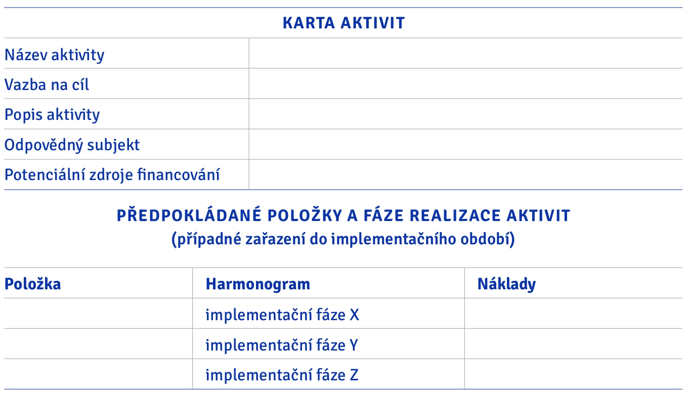 Nejdůležitější je vazba aktivity na cíl a určení, kdo je za její splnění zodpovědný (subjekt, organizace apod.). Náklady se při návrhu aktivity většinou nedají odhadnout, proto tuto část lze doplnit později. Jak může vypadat konkrétní zpracování, můžete vidět například ve strategiích měst Tábor a Rožnov pod Radhoštěm.