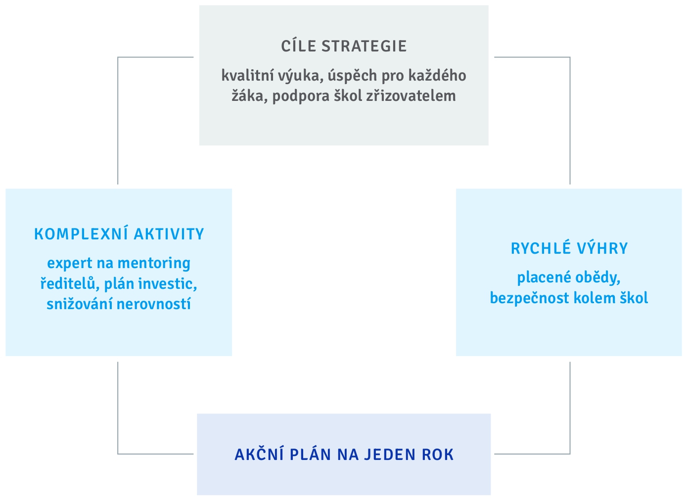 Výběr aktivit by měl řešit jak dlouhodobé (komplexní) aktivity, tak také „rychlé výhry” (tzn. rychle viditelné pozitivní změny) pro zvýšení spokojenosti různých aktérů (rodiče, učitelé, žáci).